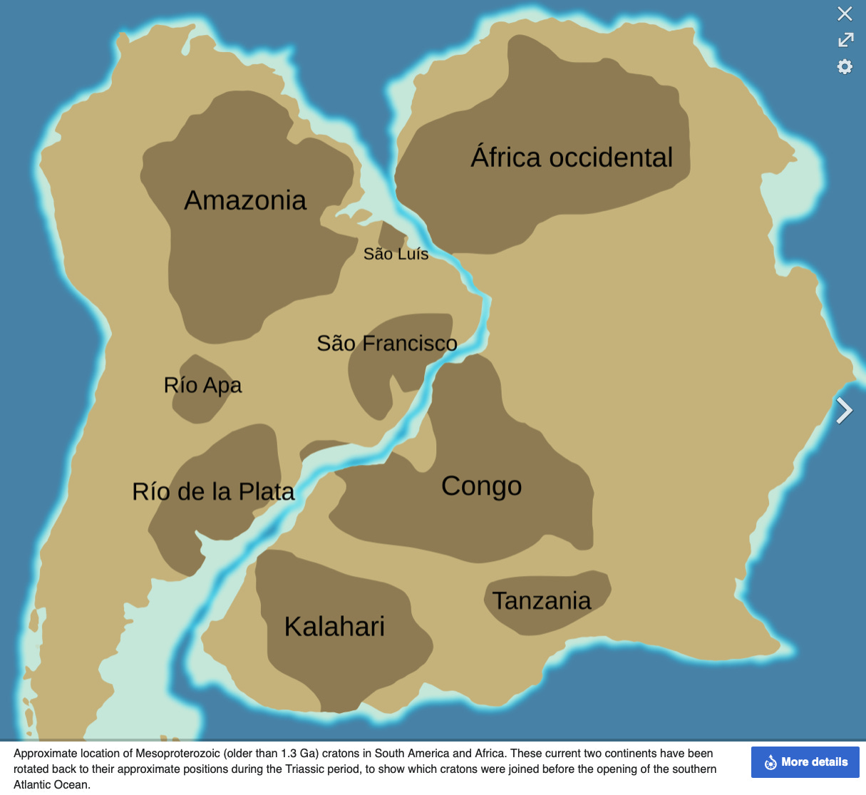 Geophys. Res. Lett. (2023) 10.1029/2023GL105178: "Earth's early crustal water source." Archean [think really archaic] 'cratons' are remanants of the very first continents formed on Earth. But forming these first continents would have required the proper chemistry and dynamics, with a water source in the mantle being one of the toughest problems to explain. "Wu et al. hypothesize that a water-rich [subsurface] magma ocean may have overturned after the moon-forming impact, supplying sufficient water to the lithosphere to generate Earth’s earliest continental crust." This hypothesis may resolve the question of the source of much of our water [later contributions from asteroids], as well as other features of very early crustal growth. So the next time you look up at the Moon, realize that the impact which formed our satellite may also have released huge amounts of water from the deeper mantle of the planet to kick-start our ocean. The Wikipedia graphic shows the location of the cratons of what are now South America and Africa. The cratonic structures are older than 1.3 billion yrs. No doubt all of this would be a bit hard for a Young-Earth creationist to swallow. But the geologic history of our planet is a beautiful story.
