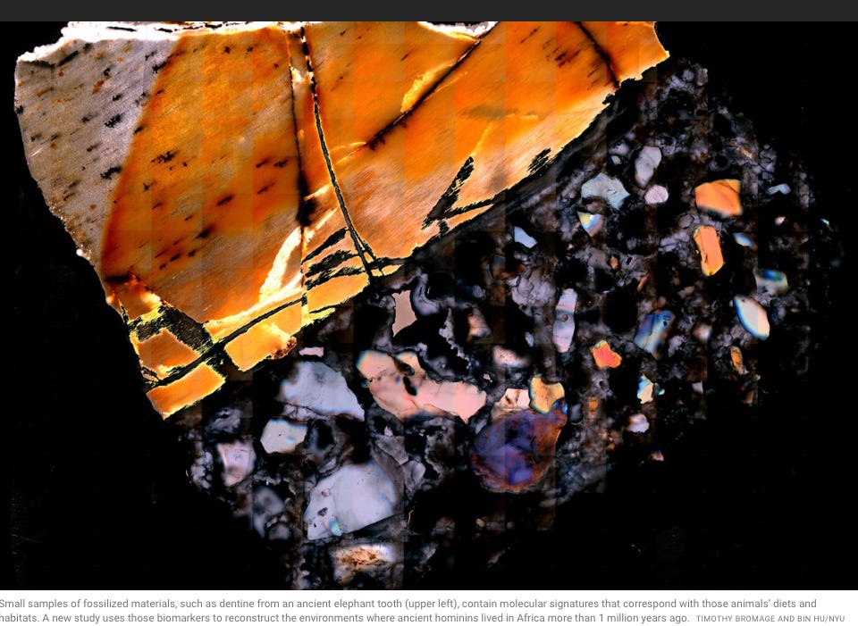 Tim Bromage, biologic anthropologist at New York University, + his collaborators studied “fossilized bones and teeth from animals excavated from areas near ancient hominin sites, including Olduvai Gorge in Tanzania, Makapansgat in South Africa, + Chiwondo Beds in Malawi.” Using a mass spectrometer, they compared metabolites to databases of compounds known to be made by similar living [extant] organisms. “Surprisingly, these analyses revealed thousands of metabolites in each sample, hundreds of which could be matched definitively to contemporary organisms.” Two gerbils and one squirrel from Olduvai Gorge contained metabolites associated with the genes that metabolize estrogens. “A squirrel from Olduvai Gorge, the elephant from the Chiwondo Beds, + a bovid from Makapansgat contained metabolites possibly associated with immune response to Trypanosoma brucei, the parasite that causes ‘sleeping sickness’ in humans.”
